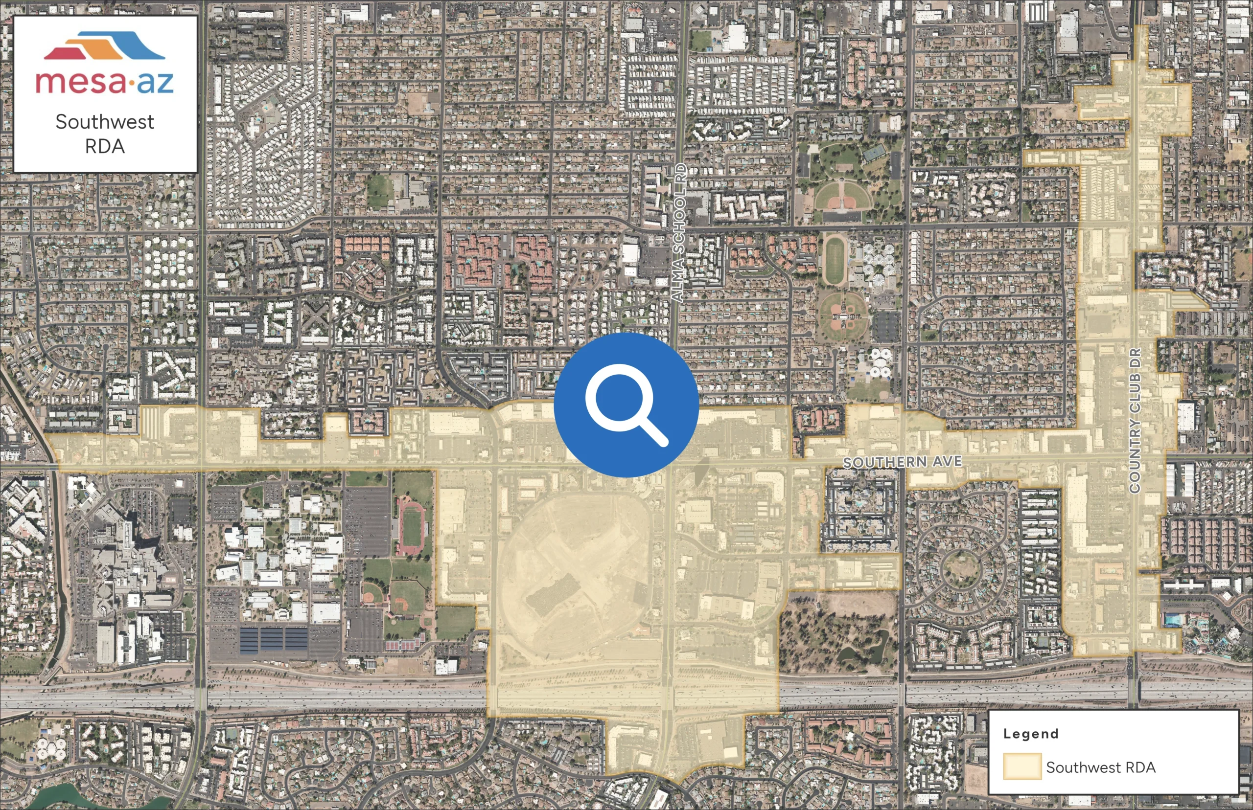 The Southwest Redevelopment Area offers investors a rare combination of scale, access, and built-in demand. Immediate proximity to US-60 provides strong regional connectivity, while adjacency to Banner Desert Medical Center anchors a stable healthcare market with long-term employment and service demand. Large-scale redevelopment opportunities, including the emerging Palo District, allow investors to shape a next-generation district at meaningful scale. Supported by growing housing density, an established mix of local and national dining options, and neighborhood-serving retail, the Southwest RDA presents a balanced, resilient environment for catalytic mixed-use, healthcare, and destination-driven investment.